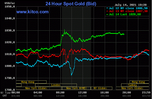 Giá vàng thế giới trên sàn Kitco giao dịch ở mức 1827 – 1828 USD/ ounce. Giá vàng cao hơn từ giữa phiên giao dịch của Mỹ hôm thứ Tư đạt mức cao nhất trong ba tuần. Tâm điểm thị trường vào giữa tuần là phát biểu của Chủ tịch Cục Dự trữ Liên bang Jerome Powell trước ủy ban Hạ viện về chính sách tiền tệ và nền kinh tế của Mỹ.