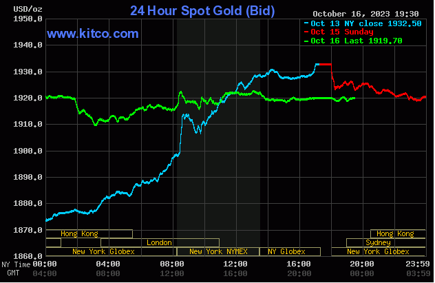 Giá vàng thế giới trên sàn Kitco mở phiên giao dịch ở mức 1919.8 - 1920.8 USD/ounce. Trong phiên, giá vàng dao động trong khoảng 1908.4 - 1925.5 USD/ounce.