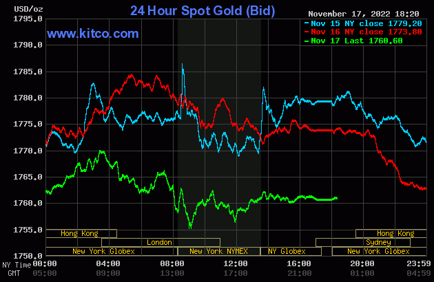 Giá vàng thế giới trên sàn Kitco mở phiên giao dịch ở mức 1760.7 – 1761.7 USD/ounce. Giá vàng giao kỳ hạn tháng 12 giảm 15,1 đô la Mỹ xuống còn 1.760,7 đô la Mỹ/ounce.