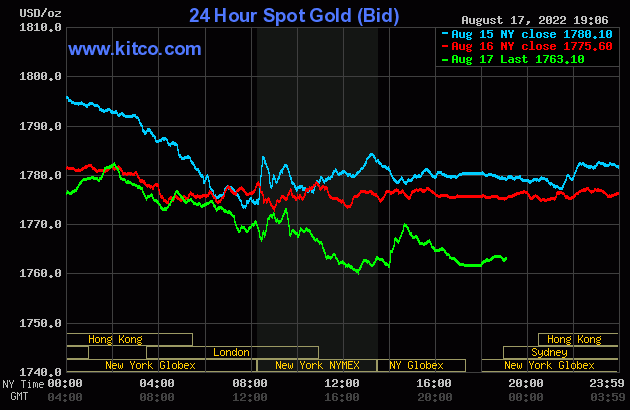 Giá vàng thế giới trên sàn Kitco giao dịch ở mức 1763.2 – 1764.2 USD/ounce. Giá vàng thời hạn tháng 10 giảm 11 đô la Mỹ ở mức 1.768,5 đô la Mỹ/ounce.