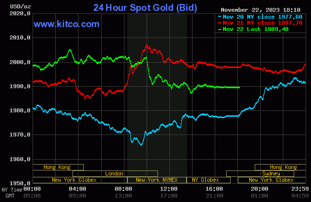 Giá vàng thế giới trên sàn Kitco mở phiên giao dịch ở mức 1989.4 - 1990.4 USD/ounce. Trong phiên trước, kim loại quý giao dịch trong khoảng giá 1986.2 - 2006.7 USD/ounce.