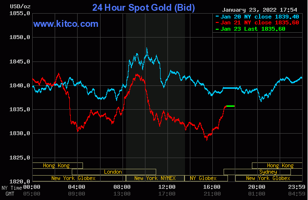 Giá vàng thế giới trên sàn Kitco giao dịch ở mức 1833.6 – 1834.6 USD/ounce. Giá vàng giảm nhẹ gần 2 USD/ounce so với chốt phiên cuối tuần.