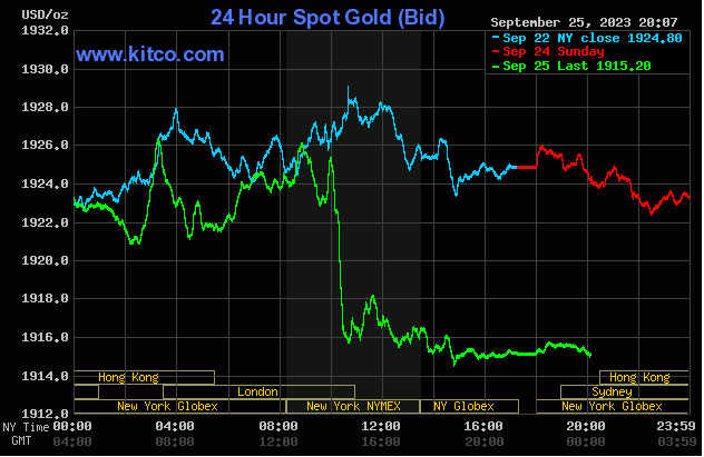 Giá vàng thế giới trên sàn Kitco mở phiên giao dịch ở mức 1915 - 1916 USD/ounce. Trong phiên trước, giá vàng dao động trong khoảng 1914.5 - 1927.9 USD/ounce.