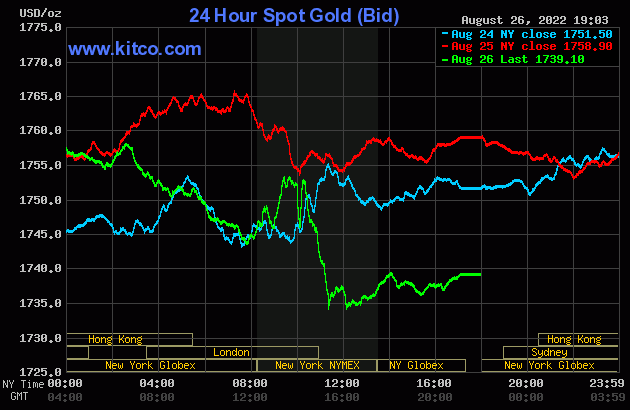 Giá vàng thế giới trên sàn Kitco chốt phiên giao dịch cuối tuần ở mức 1739.1 – 1740.1 USD/ounce. Trong phiên cuối cùng trong tuần, giá vàng dao động trong mức 1733.9 – 1759.4 USD/ounce.