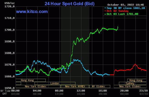 Giá vàng thế giới trên sàn Kitco giao dịch ở mức 1700.2 – 1701.2 USD/ounce. Giá vàng tháng 12 tăng 27,4 đô la Mỹ ở mức 1699,2 đô la Mỹ/ounce. Trong phiên trướ , kim loại quý giao dịch trong mức 1660.1 – 1703.4 USD/ounce.