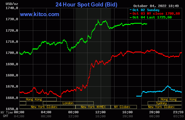 Giá vàng thế giới trên sàn Kitco giao dịch ở mức 1725.80 / 1726.8 USD/ounce. Giá vàng tháng 12 tăng 32,40 đô la Mỹ ở mức 1.734,60 đô la Mỹ/ounce. Trong phiên trước , kim loại quý giao dịch trong mức 1697.9 – 1731 USD/ounce.