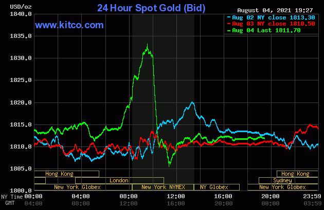 Giá vàng thế giới trên sàn Kitco giao dịch ở mức 1811.8 – 1812.8 USD/ ounce. Giá vàng kỳ hạn tháng 12 giao dịch lần cuối ở mức 1.814,10 USD / ounce, không thay đổi mấy so với phiên trước. Đầu phiên giao dịch ngày thứ Tư, kim loại quý này đã tăng 1% trong ngày.