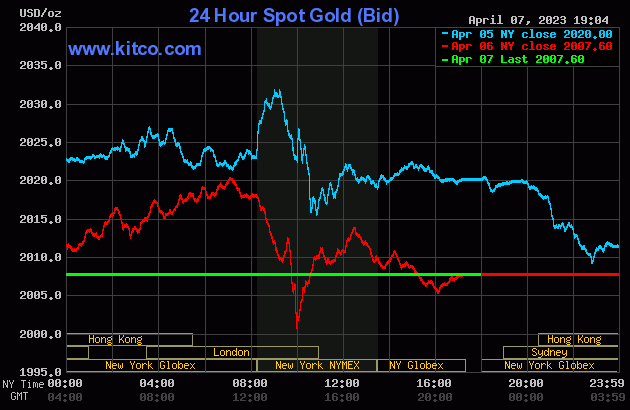 Giá vàng thế giới trên sàn Kitco khép phiên giao dịch cuối tuần ở mức 2007.6 - 2008.6 USD/ounce. Trong phiên, giá vàng giao dịch trong khoảng 2000.2 - 2021.7 USD/ounce.
