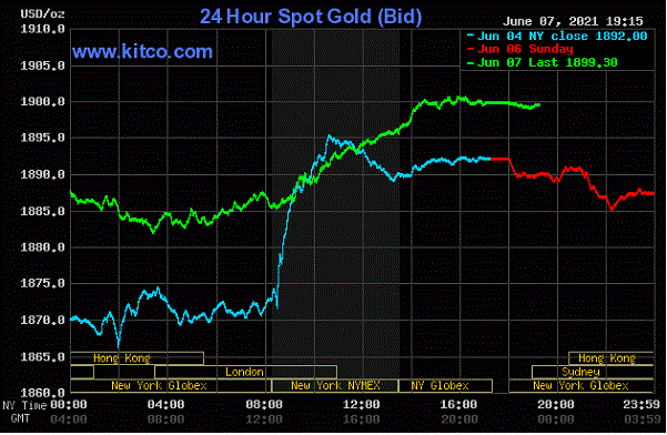 Giá vàng hôm nay 7/6/2021 ghi nhận tăng khiêm tốn nhưng đủ chạm mốc 1900 USD/ounce.