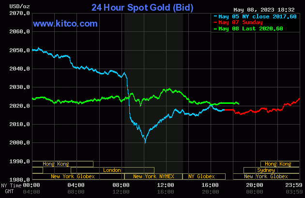 Giá vàng thế giới trên sàn Kitco mở phiên giao dịch ở mức 2020.8 - 2021.8 USD/ounce. Giá vàng kỳ hạn tháng 6 tăng 11,1 đô la lên 2.035,8 đô la Mỹ/ounce.