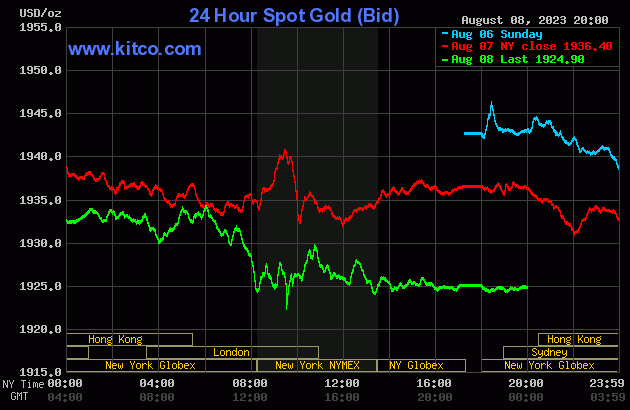 Giá vàng thế giới trên sàn Kitco khép phiên giao dịch ở mức 1924.7 - 1925.7 USD/ounce. Giá vàng kỳ hạn tháng 12 giảm 9,6 đô la ở mức 1.960,50 đô la Mỹ/ounce.
