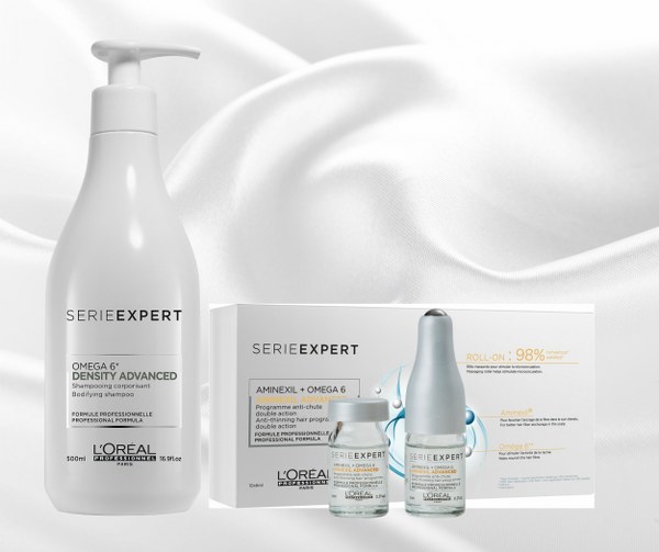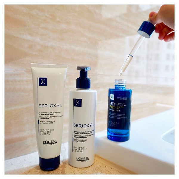 Bộ sản phẩm Serioxyl của L’Oréal Professionnel điều trị tóc thưa, mảnh, và rụng bao gồm: dầu gội, dầu xả và tinh chất mọc tóc.