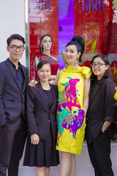 Giáng My chụp ảnh kỷ niệm cùng các nhân viên của hai nhà mốt Việt khi đi mua sắm đầu năm.