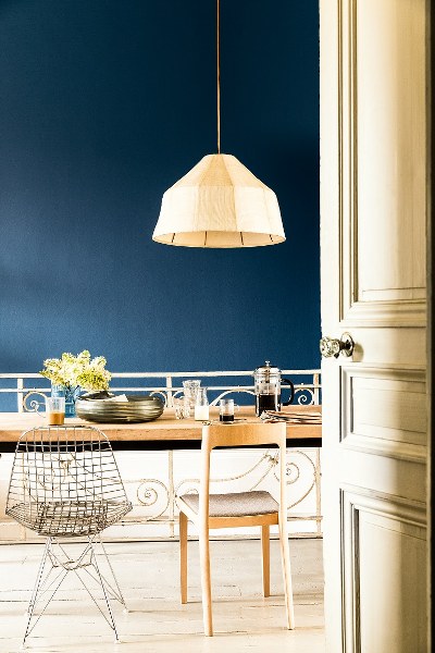 Nếu thích những đường nét thanh mảnh, có thể thay mảng tường nhấn bằng những đường nhấn màu xanh. Viền bàn, viền ghế, viền cửa… – những đường xanh ấy sẽ khiến mọi thứ trở thành nhẹ nhõm.