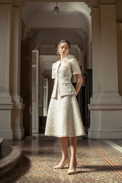 Bộ đầm cuối cùng Holly Holiday dành cho mùa lễ hội cuối năm chính là suit A line màu begie được làm từ chất liệu tweed kèm họa tiết hoa khéo léo tô điểm trên ngực trái. Trang phục này sẽ thể hiện trọn vẹn nét thuần khiết cùng vẻ đẹp những của đường cong mềm mại trên cơ thể các quý cô.