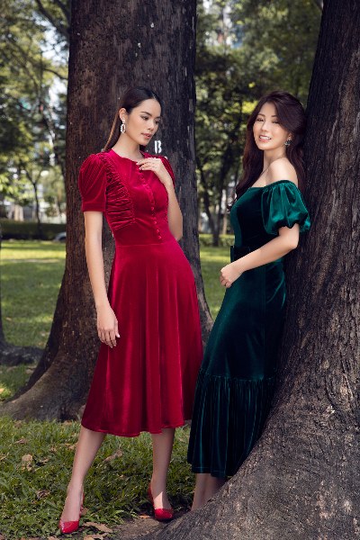 Đầm A tay phồng xếp pli làm từ chất liệu đặc trưng mùa lễ hội: nhung với 2 sắc màu cơ bản đỏ, xanh lục tôn lên vóc dáng đài cát, hoa lệ của người phụ nữ.