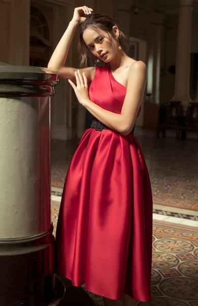 Sắc đỏ của những chùm quả mọng holly đã được nhà thiết kế thể hiện trọn vẹn trên bộ đầm circle tùng xếp pli chất liệu lụa taffeta. Kiểu dáng bất đối xứng cùng thắt lưng điểm xuyết chính là điểm đặc biệt đánh thức nét gợi cảm, yêu kiều của những quý cô theo đuổi phong cách nữ tính.
