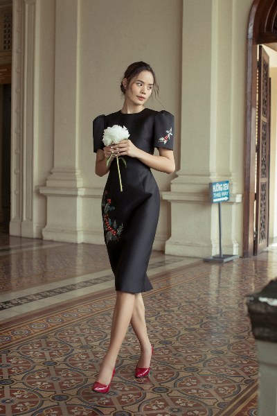 Hiện đại, sang trọng, bộ đầm bút chì tay phồng, xếp nơ trước với sắc xanh đen bí ẩn sẽ giúp quý cô ghi trọn điểm với người đối diện ở bất cứ bữa tiệc nào trong dịp cuối năm.