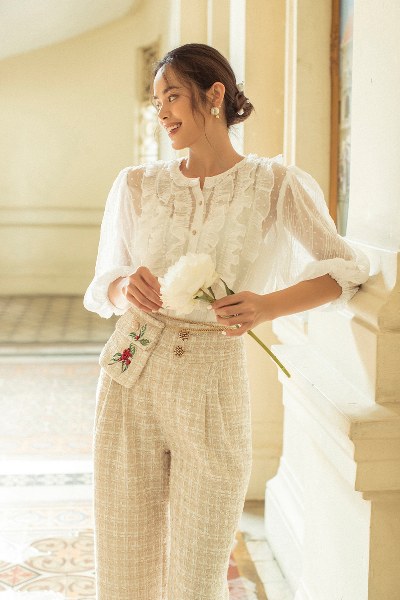 Sắc trắng cùng xanh lục lam trong những lễ hội mùa đông là nguồn cảm hứng mới để Holly Holiday cho ra đời thiết kế áo conset tay bèo nơ eo phối quần âu hay áo sơ mi phối suit được làm từ chất liệu lụa satin ánh nhung.