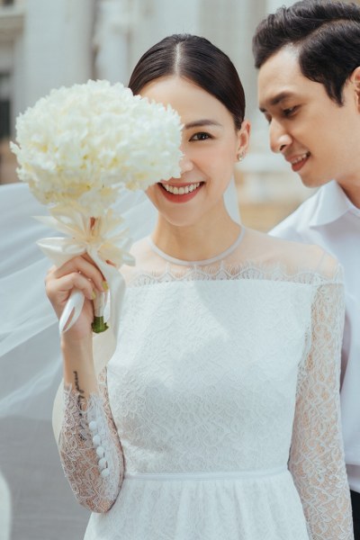 Không điều gì khác ngoài chi tiết xếp nếp tạo tay bồng, màu trắng tinh khôi của chiếc đầm và cả các trang sức, phụ kiện cùng vẻ đẹp cá nhân và sự rạng rỡ làm nên vẻ đẹp ngày cưới của cô dâu.