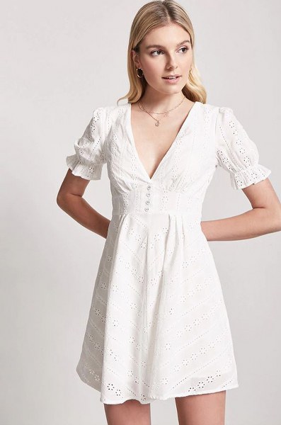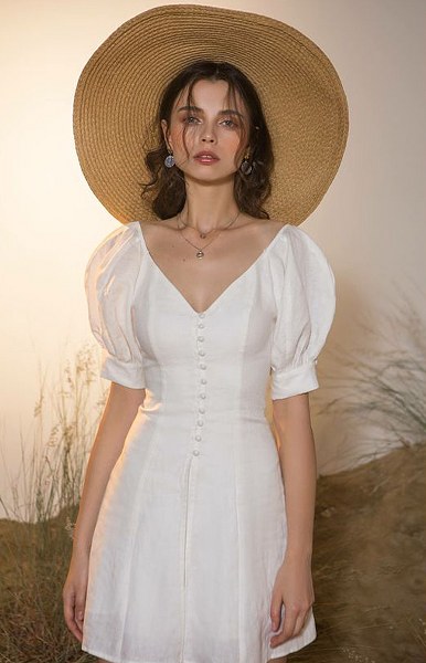 Váy cao qua gối được thêm các điểm nhấn xinh xắn ở cổ áo chữ V, tay bồng và đặc biệt là hàng nút bọc vải điệu đà