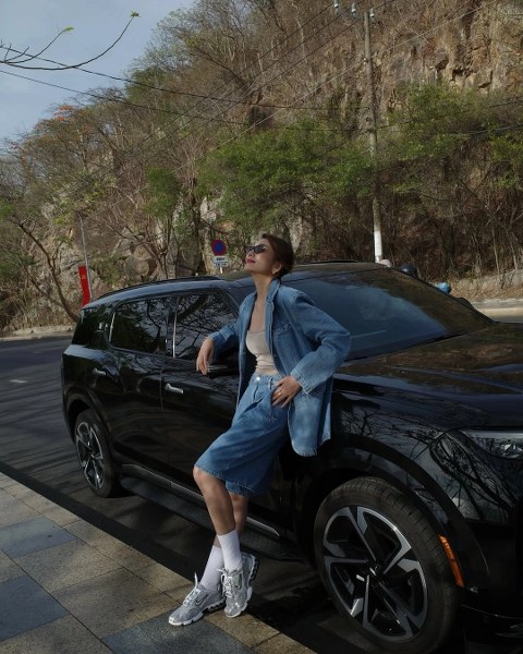 Ngoài những bộ cánh nữ tính, thỉnh thoảng cô chọn đồ hơi hướng unisex, như cả "cây" denim và giày thể thao.