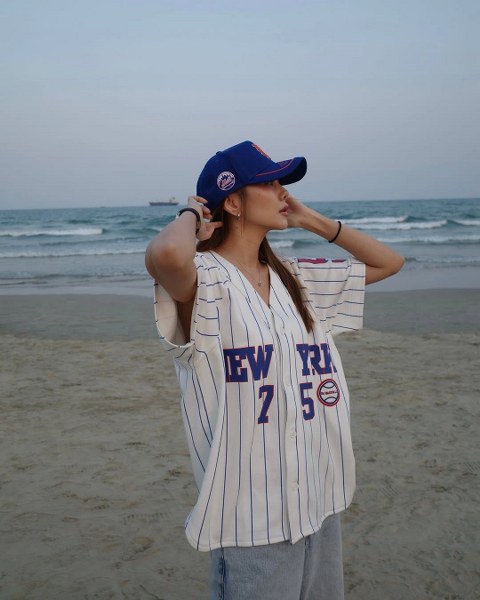 Thời trang dạo biển của diễn viên Mỹ nhân kế với mốt áo thể thao và quần jeans ống rộng.