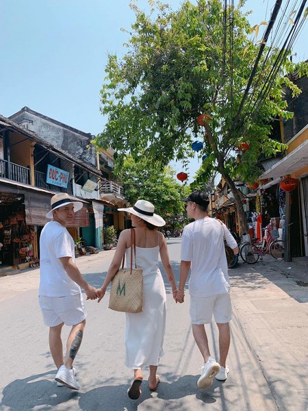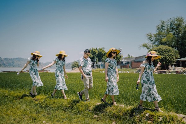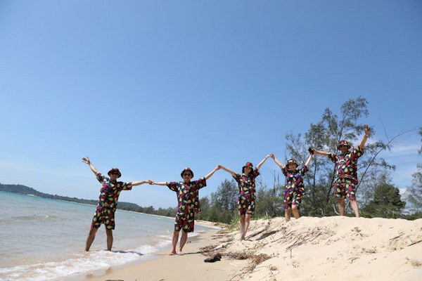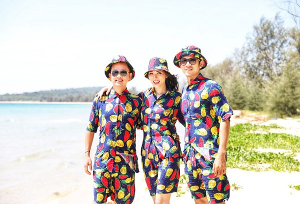 Khi đi du lịch biển cùng bạn bè, đạo diễn Nguyễn Quý Khang (trái) đã chọn trang phục in họa tiết trái cây cho cả nhóm để tạo cảm giác vui tươi, tinh nghịch và trẻ trung.