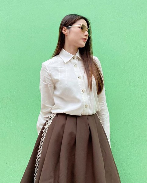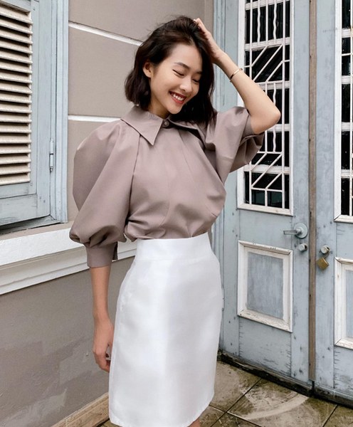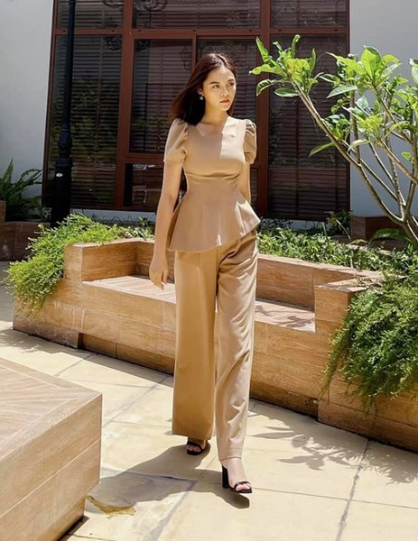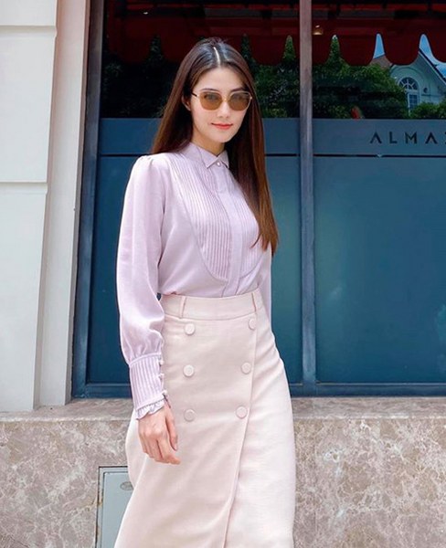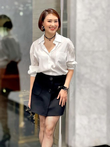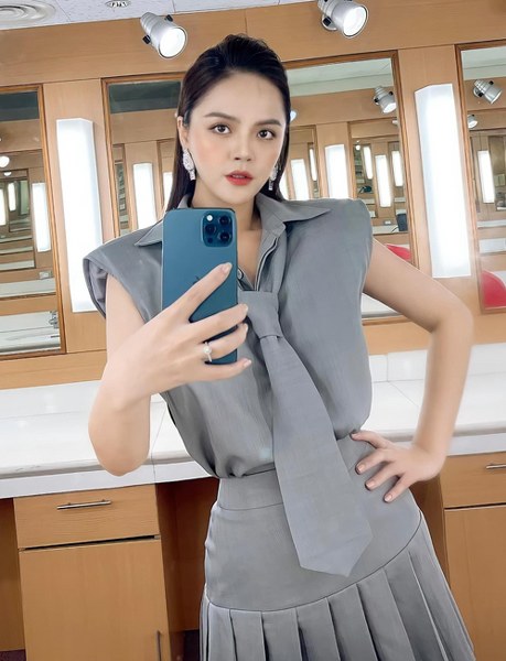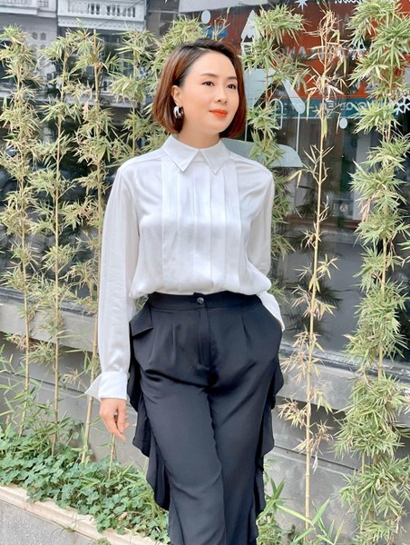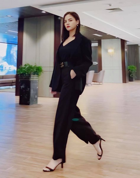 Phong cách công sở cũng được Hồng Diễm yêu thích ở đời thường với tiêu chí tối giản màu sắc, tạo điểm nhấn trong kiểu dáng.