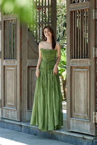 Phương Anh diện đầm maxi xếp ly trong một chuyến du lịch kết hợp công tác. Tông màu vàng tươi giúp người đẹp tôn làn da.
