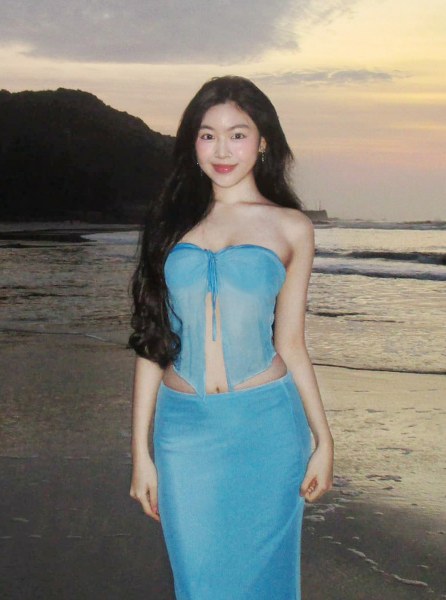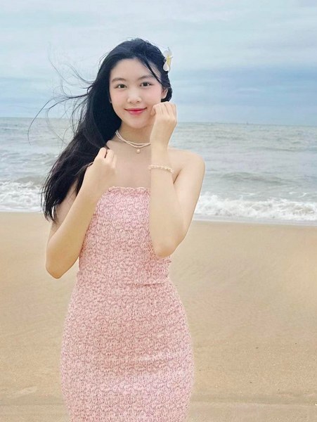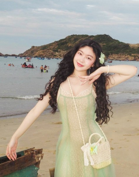 Ở tuổi 18, con gái Quyền Linh chọn phong cách quyến rũ thay vì tiểu thư, nhẹ nhàng trước kia. Cô mặc đầm hai dây kết hợp túi cói trong chuyến nghỉ mát cùng gia đình.