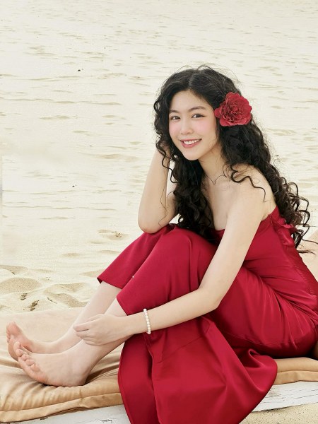 Trước đó, cô chọn chiếc đầm lụa cúp ngực tông đỏ tôn da, tạo dáng trên bãi biển ở quê mẹ - Bình Định. Lọ Lem để kiểu tóc xoăn cài hoa, trang điểm tự nhiên.