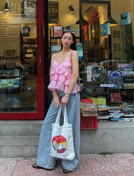 Thời trang đường phố của Hoa hậu Lương Thùy Linh với áo babydoll, quần ống rộng và giày búp bê lưới - mốt hot hai năm nay.