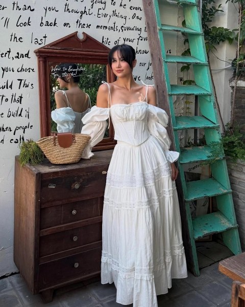 Hoa hậu Phương Khánh lăng xê phong cách "cô gái vắt sữa" của châu Âu, kết hợp áo corset hai dây và chân váy maxi đồng điệu.