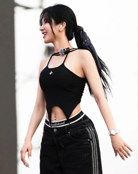 Ca sĩ Diệp Lâm Anh chọn crop top và quần cạp trễ đồng màu theo mốt khoe nội y.