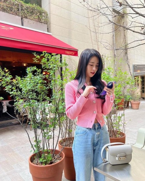 Chiếc áo len màu hồng ngọt ngào sẽ vô cùng phù hợp với tiết trời ngày xuân. Kết hợp quần denim màu xanh nhạt cùng chiếc túi đeo vai màu kem, mang đến một tổng thể hài hòa, tươi trẻ.