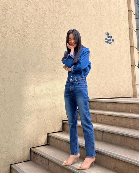 Áo sơ mi denim cùng quần jeans đơn giản, năng động được kết hợp với giày cao gót màu nude điệu đà, set đồ vô cùng sành điệu và nổi bật giúp "ăn gian" chiều cao một cách đáng kể.