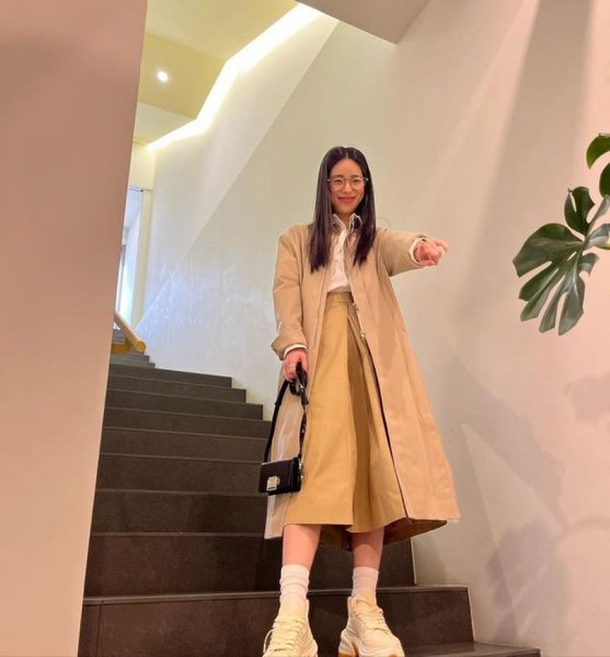 Lim Ji Yeon luôn biết cách lựa chọn trang phục sao cho chúng đồng điệu với nhau về màu sắc. Sơ mi trắng, váy dài và áo choàng cùng tone màu mix với giày thể thao tạo cảm giác năng động mà vẫn rất nữ tính, thanh lịch.