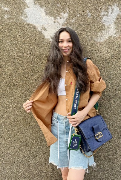Người đẹp phối bra top cùng quần shorts, sơ mi dáng rộng và túi Louis Vuitton.