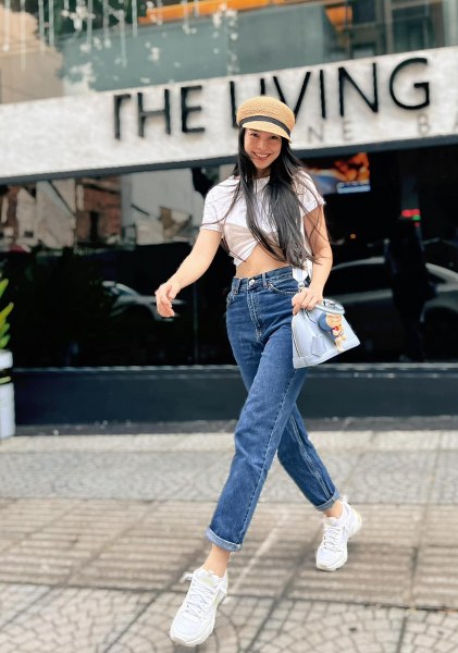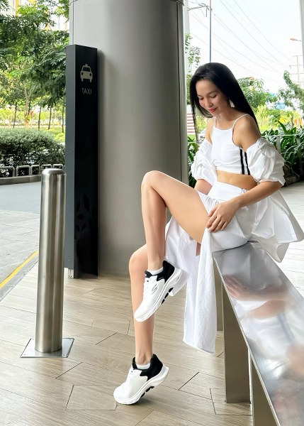 Sơ mi trắng, quần jeans và giày thể thao là công thức phối đồ được ca sĩ thường xuyên áp dụng.