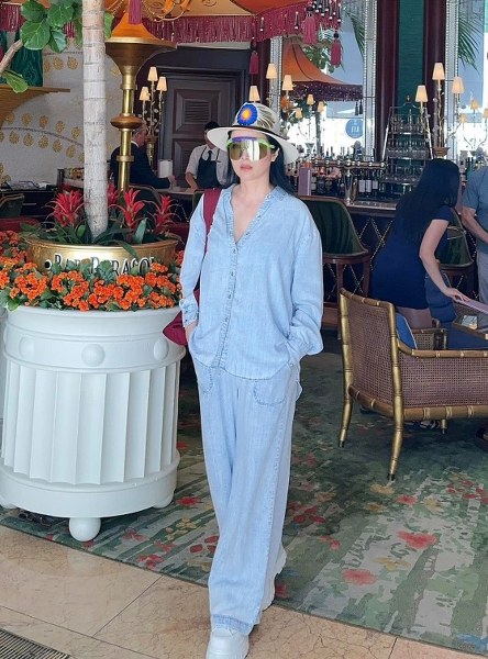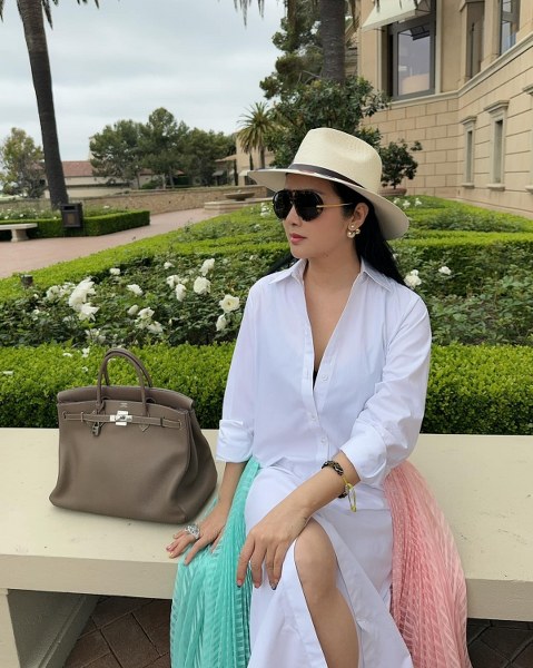 Váy dáng sơ mi - một trong những món đồ cơ bản của mùa thu - cũng được cô lựa chọn khi đi vãng cảnh. Để tăng vẻ sang trọng, cô xách túi Birkin của Hermes.