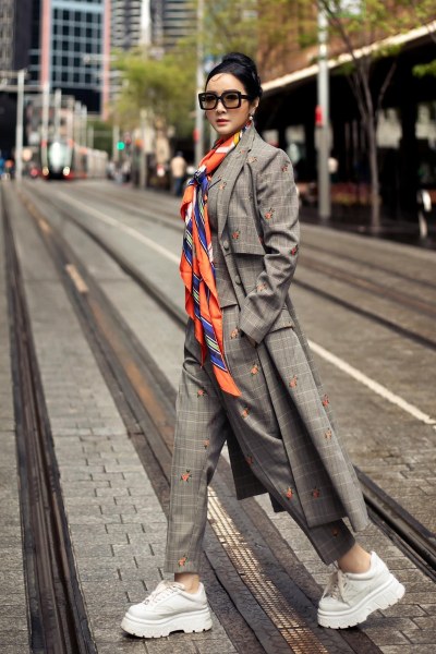 Vừa qua, Giáng My chia sẻ ảnh dạo chơi ở Sydney trong bộ suit kẻ thêu hoa kèm áo khoác dài, khăn lụa. Hoa hậu chọn sneakers để tiện di chuyển nhiều trên đường phố.