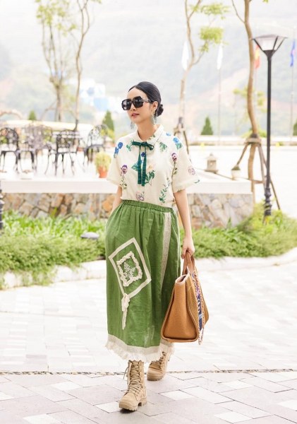 Hoa hậu Đền Hùng xuống phố với bộ cánh hướng đến thiên nhiên, gồm sơ mi cộc tay họa tiết hoa lá, váy thêu ren và túi cói của Chanel hơn 175 triệu đồng.