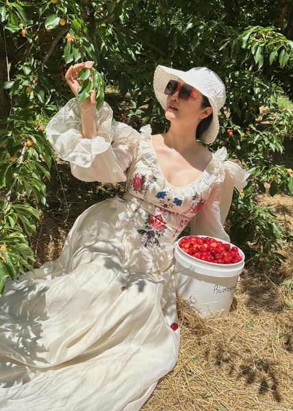 Hoa hậu theo đuổi phong cách "cô gái làm vườn" mang âm hưởng đồng quê với đầm maxi xếp bèo cùng mũ rộng vành.