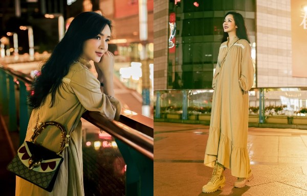 Hoa hậu Giáng My thường diện đầm maxi dài tay, hướng đến vẻ nữ tính, năng động khi tiết trời vào thu.