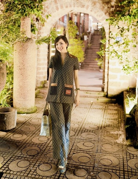 Trang phục đi ăn tối với cả "cây" denim Gucci gồm quần áo và dép "cục gạch", phối túi tote của Dior.
