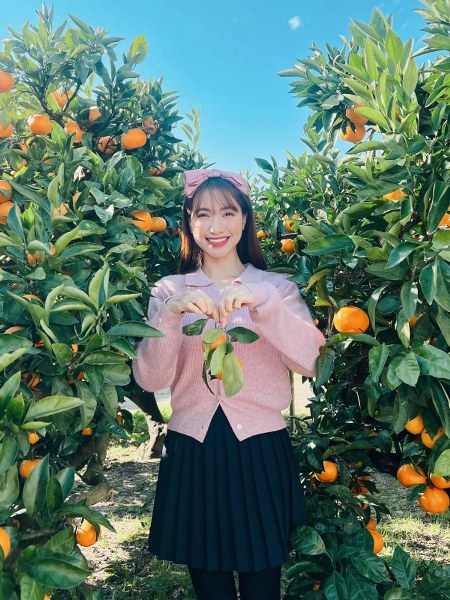 Người đẹp tạo dáng trong vườn cam với phong cách học đường.