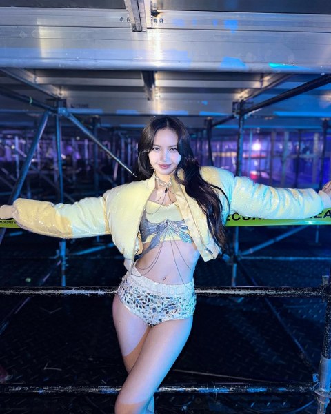 Mới đây, Lisa chia sẻ hình ảnh biểu diễn ở Jakarta, Indonesia. Cô diện catsuit bằng vải metallic, xẻ hai bên lườn, phối váy mini và bốt chunky.