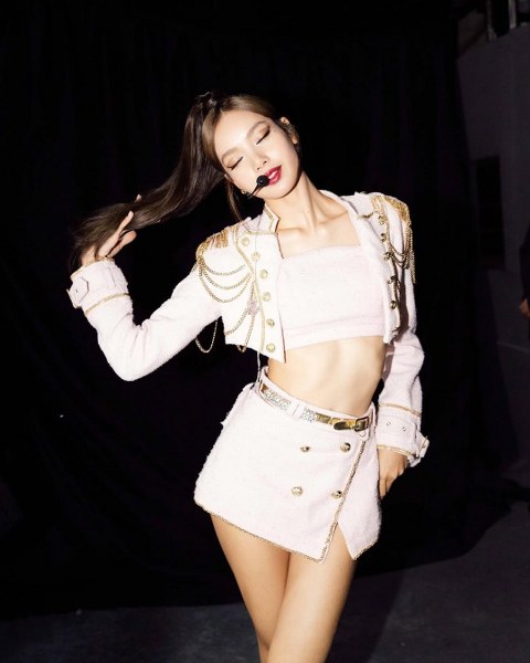 Trong một buổi biểu diễn cùng các thành viên Blackpink năm ngoái, cô phối áo giáp in 3D với bodysuit và quần chẽn.