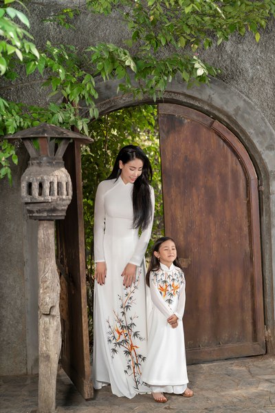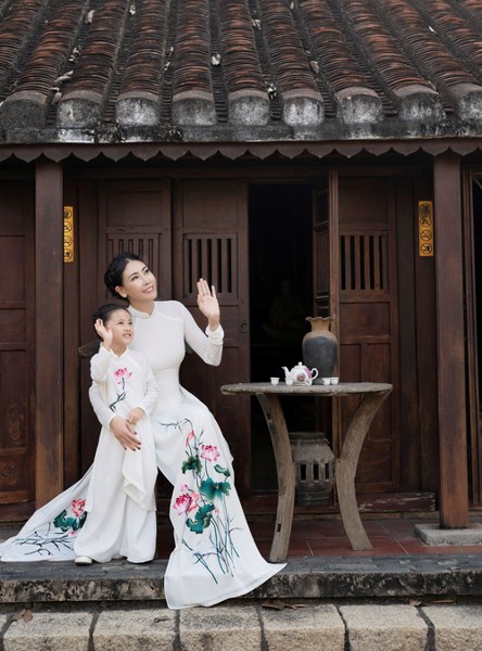 Hà Kiều Anh cùng bé Viann xuất hiện trong bộ ảnh giới thiệu các mẫu áo dài cho mẹ và bé của nhà thiết kế Thuận Việt.